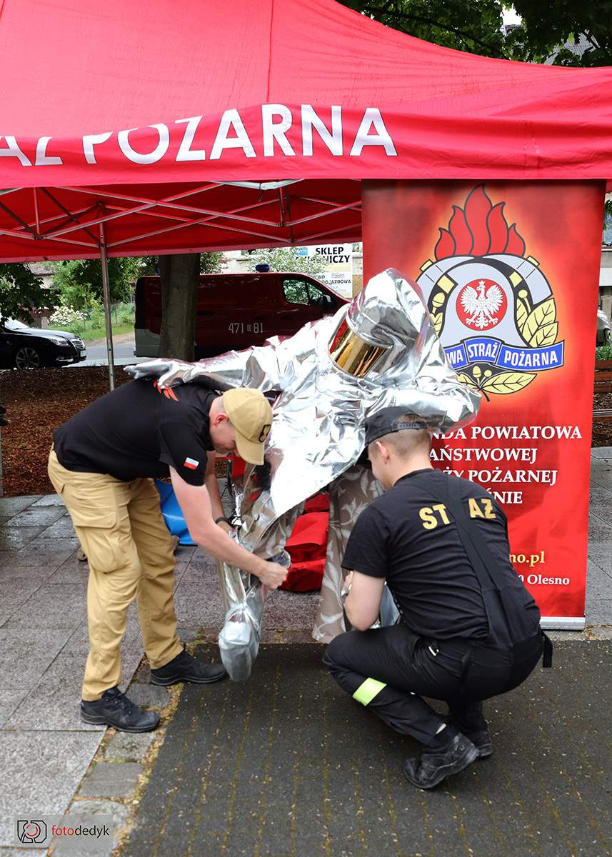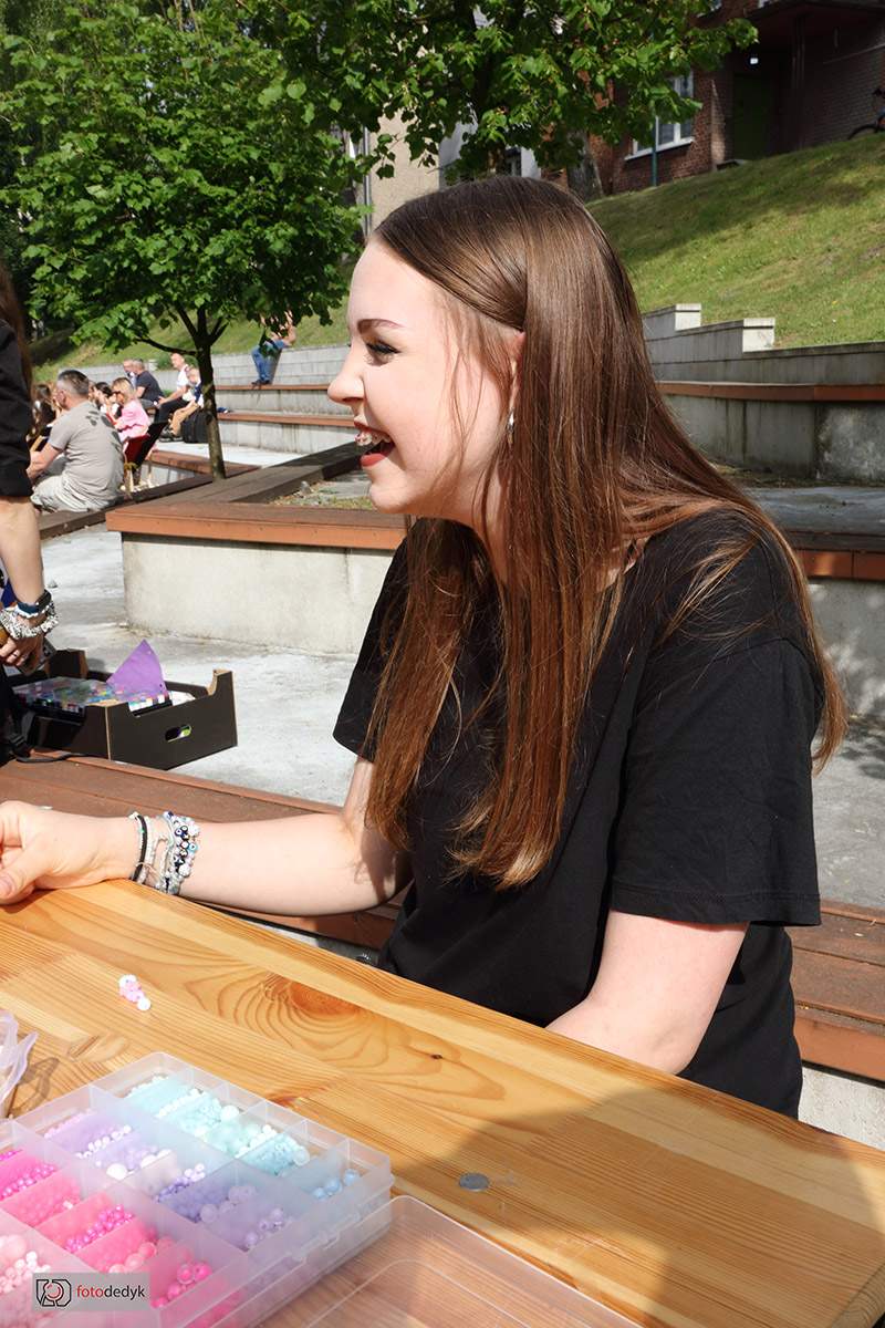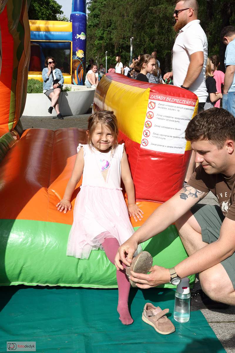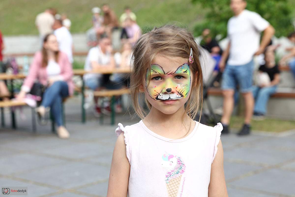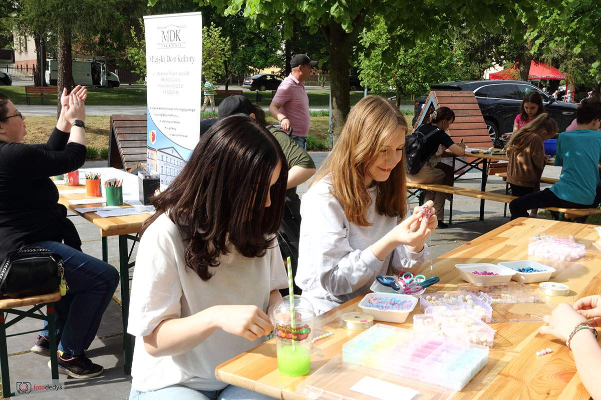 Spacerując po Promenadzie, można było przy okazji zjeść trochę pyszności przygotowanych przez Koło Gospodyń Wiejskich z Leśnej i Boroszowa. Straż pożarna zorganizowała stoisko, na którym ochotnicy mogli założyć najróżniejsze kombinezony, a Policja Olesno zaprezentowała służbowy motocykl i przeprowadziła mały quiz z zainteresowanymi uczestnikami. Najwięcej jednak atrakcji czekało na najmłodszych: dmuchańce, animacje, bańki XXL, malowanie twarzy, a także warsztaty artystyczne z malowaniem kamieni, kolorowaniem dłuuuuugiej kolorowanki i robieniem bransoletek. Kiedy już mieliśmy przejść do tanecznej części pikniku, przypomniała sobie o nas pogoda i lunął majowy deszcz