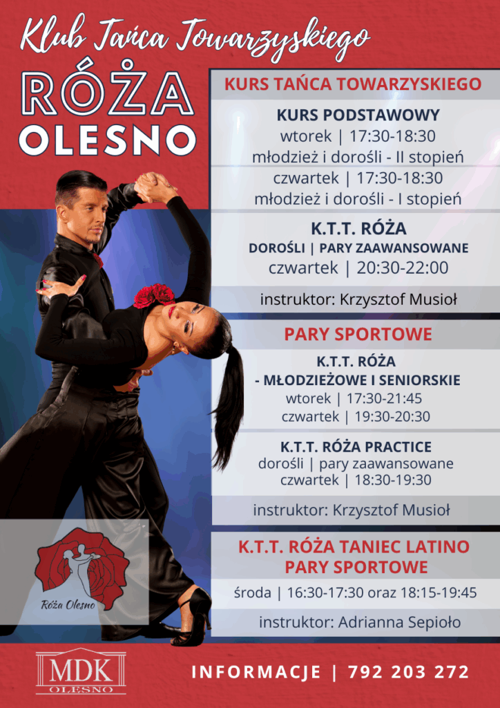 Kluba Tańca Towarzyskiego RÓŻA KLUB TAŃCA TOWARZYSKIEGO 🌹 RÓŻA 🌹 zaprasza na zajęcia wszystkie osoby początkujące, zaawansowane oraz tancerzy sportowych 💛 Zapisy prowadzi Krzysztof Musioł – 792 203 272. Anna Mann2025-09-05T13:11:04+00:00 Podziel się tym ze znajomymi! FacebookXRedditLinkedInWhatsAppTumblrPinterestVkXingEmail Podobne wpisy Ferie z MDK Spotkania przy Skacie Ferie Zimowe WARSZTATY ARTYSTYCZNE DLA SENIORÓW Mikołajkowe Przygody Warsztaty Artystyczne „Zrób swoją świąteczną choinkę” Warsztaty Artystyczne „Zrób własną pyszną czekoladę” Warsztaty Artystyczne „Zrób swoją zapachową świeczkę” 30 dni do zdrowego stylu życia – bezpłatne warsztaty BEZPŁATNE WARSZTATY ARTYSTYCZNE DLA SENIORÓW ANDRZEJKI DLA DZIECI Warsztaty artystyczne dla szkół