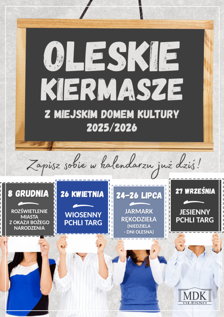 Prezentujemy kiermaszową rozpiskę 😁 Chcielibyśmy, żeby każdy pchli targ i każdy kiermasz rzeczy różnych miały swoje stałe miejsce w kalendarzu. Dlatego też przygotowaliśmy ogólne informacje o datach, które można sobie już wstępnie zarezerwować. O każdym wydarzeniu będzie informować bezpośrednio przed nim. Na kiermasz z okazji rozświetlenia miasta można zapisywać się już od środy telefonicznie: 34 358 24 45.