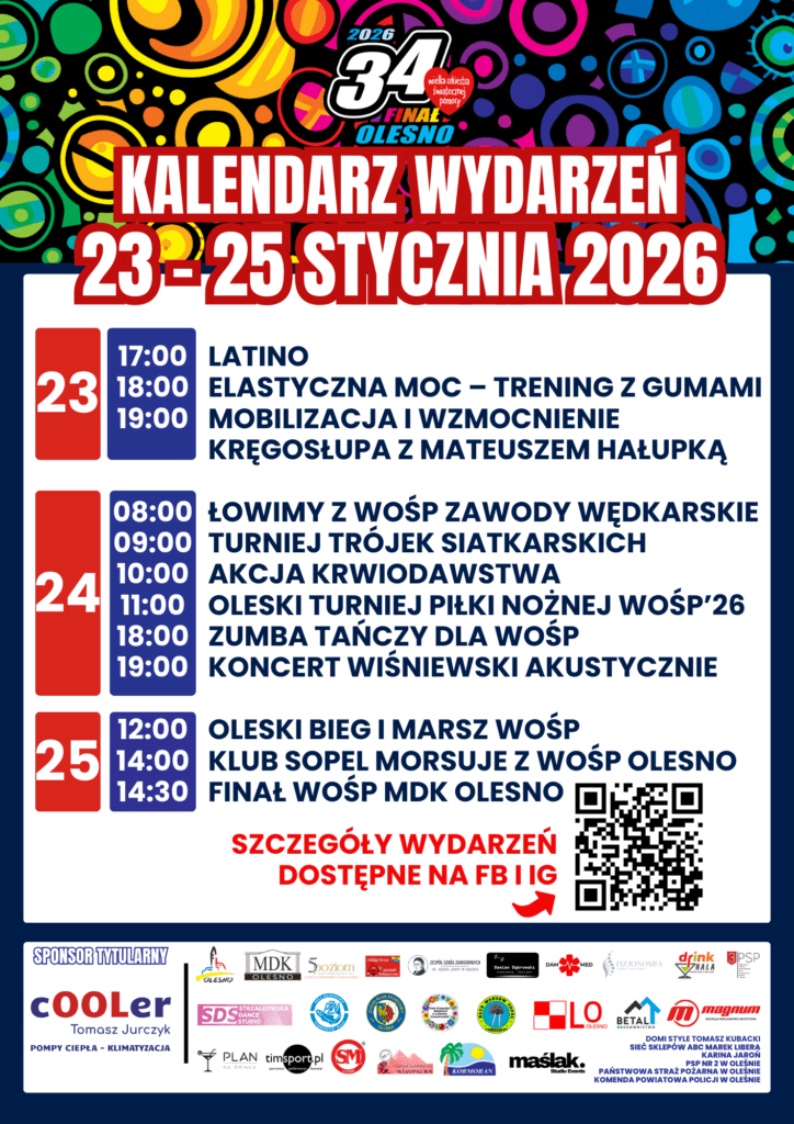 Kalendarz wydarzeń WOŚP na dni 23-25 stycznia Udostępniamy kolejną dawkę wośpowych wydarzeń – 23-25 stycznia Serdecznie zapraszamy do wspólnego grania z WOŚP – każdy znajdzie tu coś dla siebie! Anna Mann2026-01-20T11:12:06+00:00 Podziel się tym ze znajomymi! FacebookXRedditLinkedInWhatsAppTumblrPinterestVkXingEmail Podobne wpisy Aukcje WOŚP Zumba tańczy dla WOŚP Oleski Turniej Piłki Nożnej – WOŚP Mobilizacja i wzmocnienie kręgosłupa – WOŚP Akcja krwiodawstwa – WOŚP Latino Solo – zatańcz z WOŚP Kalendarz wydarzeń WOŚP na dni 16-21 stycznia Stretching dla dzieci – WOŚP Aquafitness dla WOŚP Pilates z Beatą – WOŚP Papaya x WOŚP Charyzma dla WOŚP
