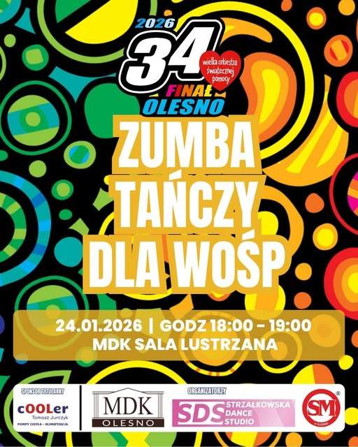 Zumba tańczy dla WOŚP Jak co roku zapraszamy wszystkich miłośników dobrej zabawy na energetyczne zajęcia ZUMBY, które poprowadzi Anna Strzałkowska-Radzioch Sobota, 24 stycznia Godz. 18:00 Sala lustrzana – Miejski Dom Kultury w Oleśnie Czeka na Was solidna dawka ruchu, pozytywnej energii i świetnej atmosfery – idealne połączenie treningu i zabawy Gramy do końca świata i jeden dzień dłużej! Anna Mann2026-01-22T14:39:40+00:00 Podziel się tym ze znajomymi! FacebookXRedditLinkedInWhatsAppTumblrPinterestVkXingEmail Podobne wpisy Aukcje WOŚP Oleski Turniej Piłki Nożnej – WOŚP Mobilizacja i wzmocnienie kręgosłupa – WOŚP Akcja krwiodawstwa – WOŚP Kalendarz wydarzeń WOŚP na dni 23-25 stycznia Latino Solo – zatańcz z WOŚP Kalendarz wydarzeń WOŚP na dni 16-21 stycznia Stretching dla dzieci – WOŚP Aquafitness dla WOŚP Pilates z Beatą – WOŚP Papaya x WOŚP Charyzma dla WOŚP