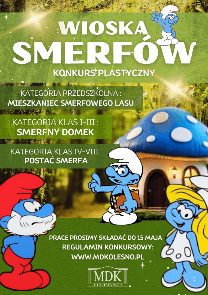 Zapraszamy do udziału w Konkursie Plastycznym „Wioska Smerfów”. Przed Miejskim Domem Kultury pojawią się małe, kolorowe domki, bajkowe stworzenia i znane smerfowe postacie.
