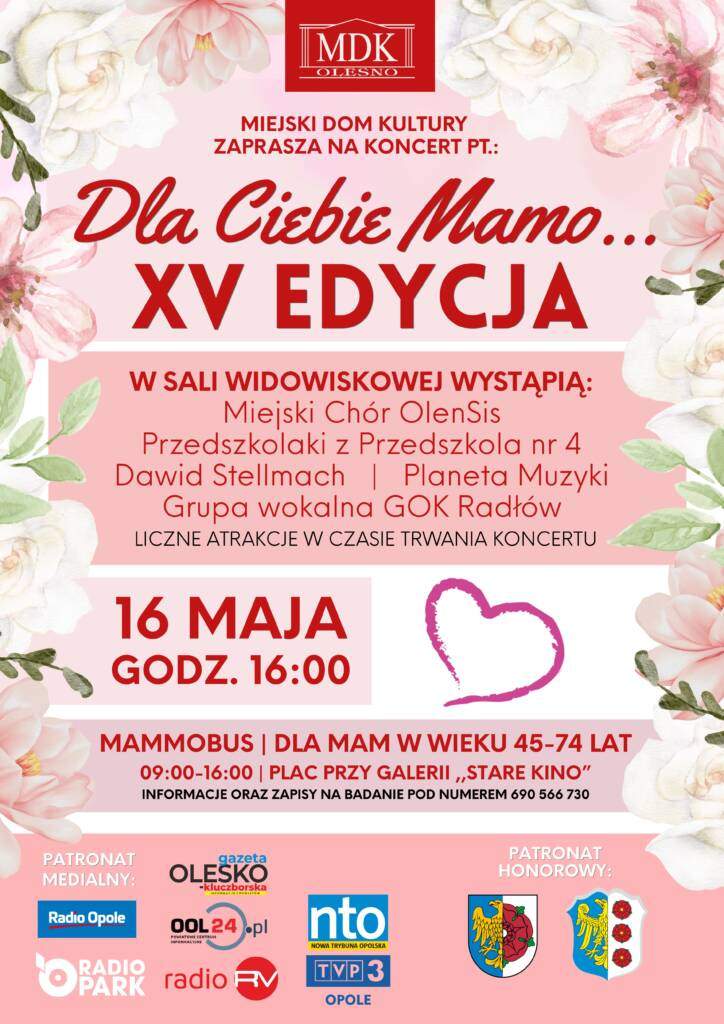 Serdecznie zapraszamy na wyjątkowy koncert z okazji Dnia Matki – „Dla Ciebie Mamo…” W tym roku świętujemy już XV edycję! To piękne, pełne wzruszeń wydarzenie, którego pomysłodawczynią jest pani Karina Duch – od lat wkłada ona całe serce w jego organizację, dbając o każdy detal i niepowtarzalną atmosferę. ❤️
